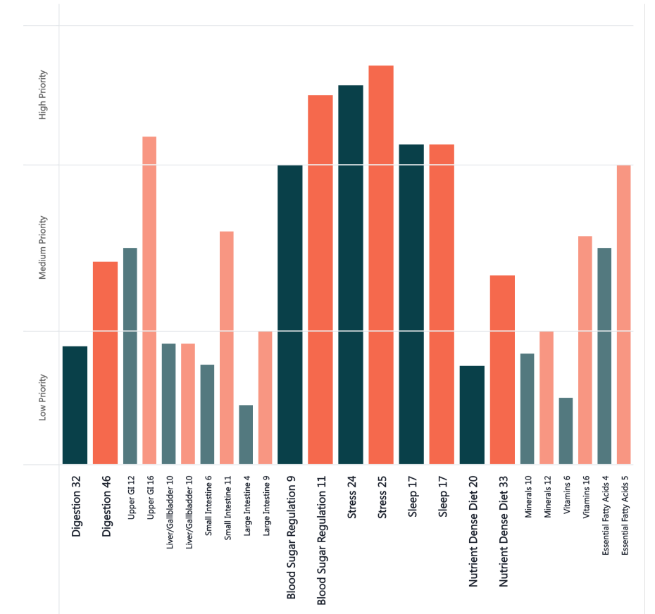 In the graph to the left, you'll notice a significant decrease in symptoms. The orange bars represent this client’s symptoms before starting the program, while the teal bars show the progress made after just two months, only HALFWAY through the Wholistic Reset program.